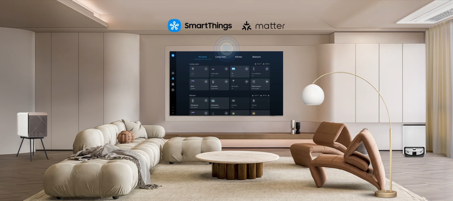 A SmartThings integrált hubként lehetővé teszi a TV-n keresztüli okoseszköz-kezelést, beleértve a Matter és HCA kompatibilis eszközöket is. Az eszközökről szóló értesítéseket közvetlenül a képernyőn kaphatod, a 3D térképnézettel pedig átláthatóan kezelheted az otthoni rendszert.