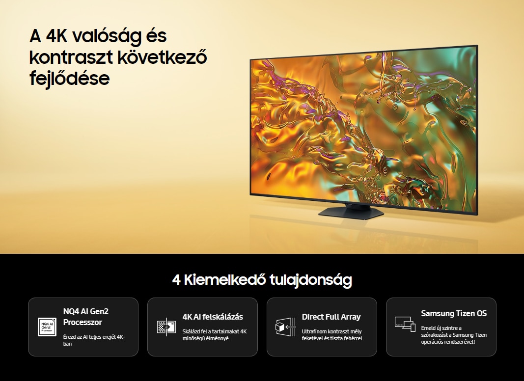 | HDR technológia | Képmotor NQ4 AI Gen2 Processzor HDR (High Dynamic Range) Quantum HDR+ HDR 10+ Igen (Adaptív) AI felskálázás 4K felskálázás Kontraszt Direct Full Array Micro Dimming Supreme UHD Dimming Kontraszt fokozás Real Depth Enhancer Mozgástechnológia Motion Xcelerator Intelligens kalibrálás Alap Filmmaker Mode (FMM) Igen HDR Brightness Optimizer Igen |